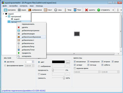 С помощью LedArt можно создать клип-программу, транслирующую текст, фото и видео и записать её на USB-Flash накопитель. Программа имеет много настроек по форматированию изображения и созданию специфических для светодиодных экранов эффектов.